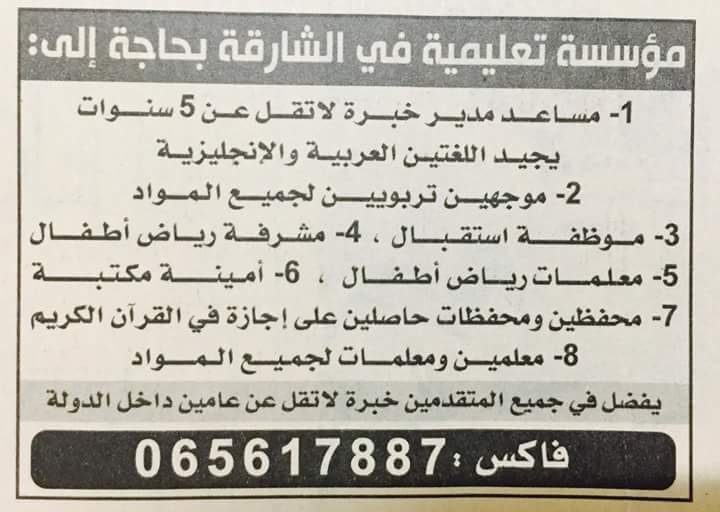 أهلا بكم فيما يلي وظائف تعليمية متعددة شاغرة لكل الجنسيات في مؤسسه تعليميه بالشارقة الامارات